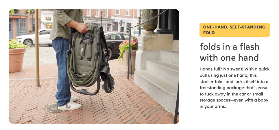 the automatic fold lock ensures the stroller is freestanding when folded so it’s easy to store at home, in the car, or on the go